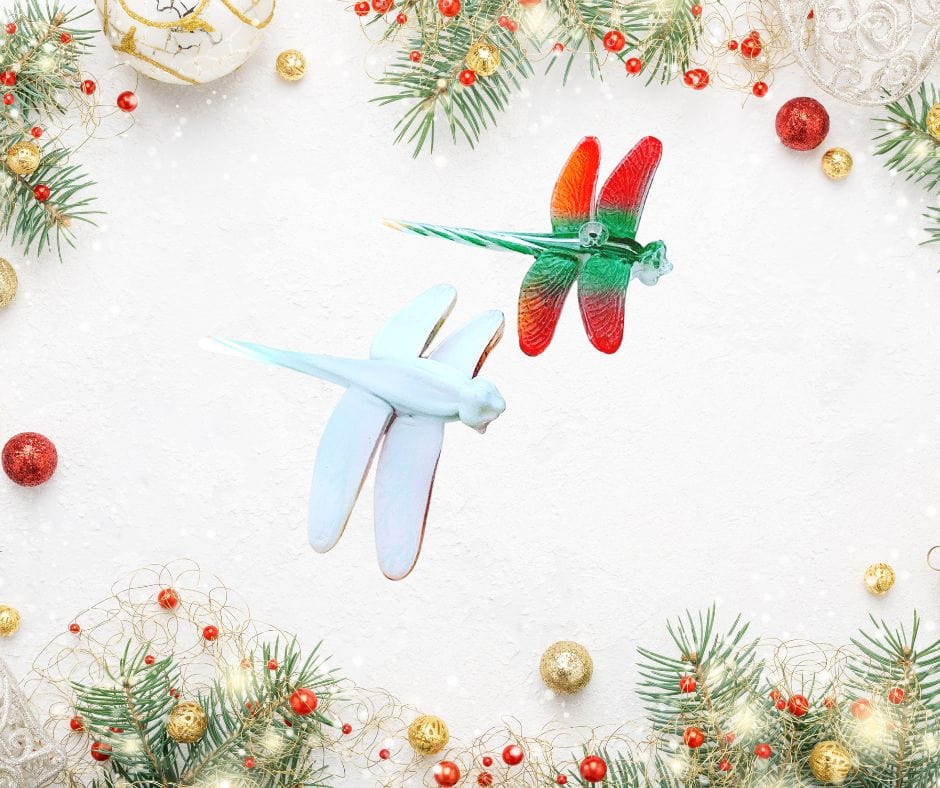 Each dragonfly is crafted in Egypt from German Pyrex glass, featuring two-tone colored wings and a soft white underside that catches the light beautifully.